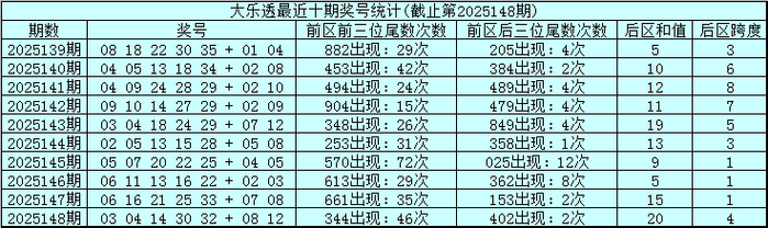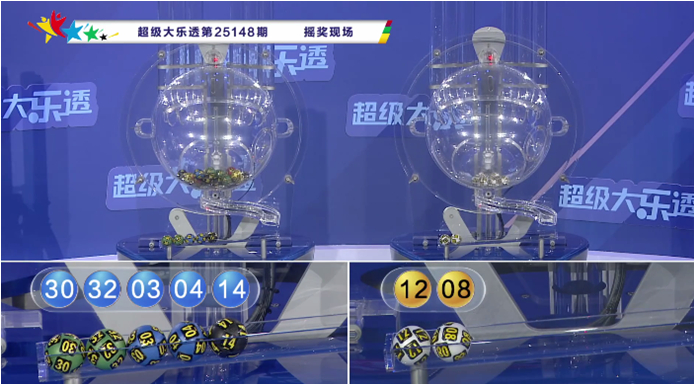 体彩大乐透第25148期奖号开出:03 04 14 30 32+08 12,前区奖号大小比为2:3,012路比为2:1:2,奇偶比为1:4,后区号码和值为20,跨度为4。