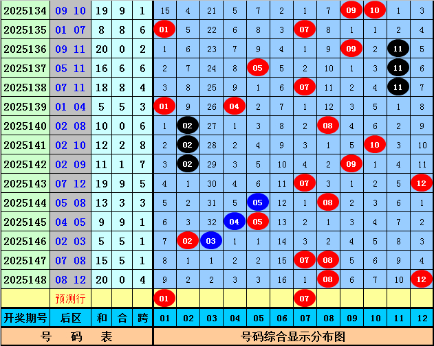 后区号码分析:上期后区开出奖号08 12,和值为20,跨度为4,本期后区参考号码01、03、07、08、11。